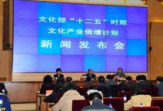 2月28日下午,,,,文化部在京召开新闻发布会,,正式向社会发布《文化部“十二五”时期文化产业倍增计划》,,,,提出了 “十二五”期间文化部门管理的文化产业增加值年平均现价增长速度高于20%,,,2015年比2010年至少翻一番,,,,实现倍增的奋斗目标。。